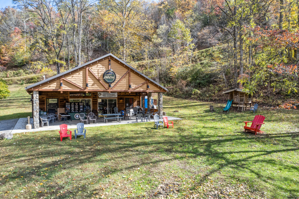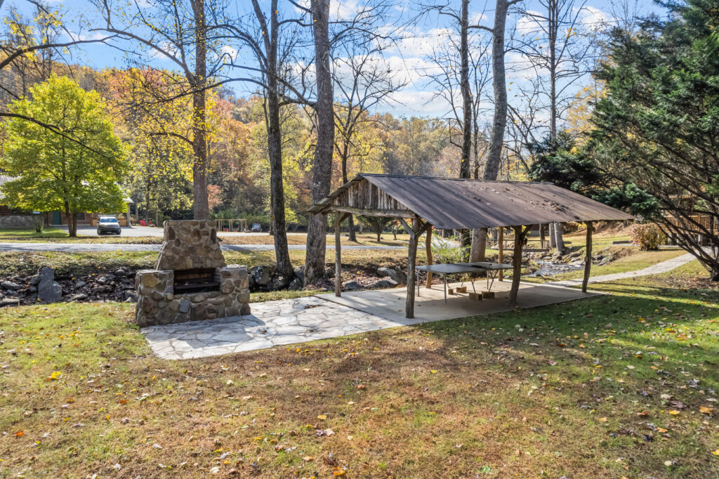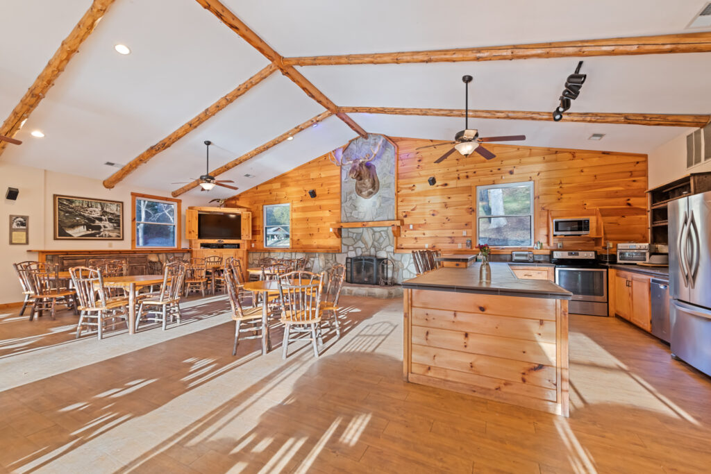 You will know that you’ve come across something unique the first time you visit Harmony Hall. A rustic lodge style hall that opens to a covered pavilion and mountain meadow below with a large outdoor fire pit perfect for bonfires and roasting marshmallows under the stars. The large wood burning fireplace serves as home to the family moose. Get cozy inside for any occasion or step outside to take in the mountain air underneath the covered pavilion. There’s plenty of room for outdoor grilling and chilling!