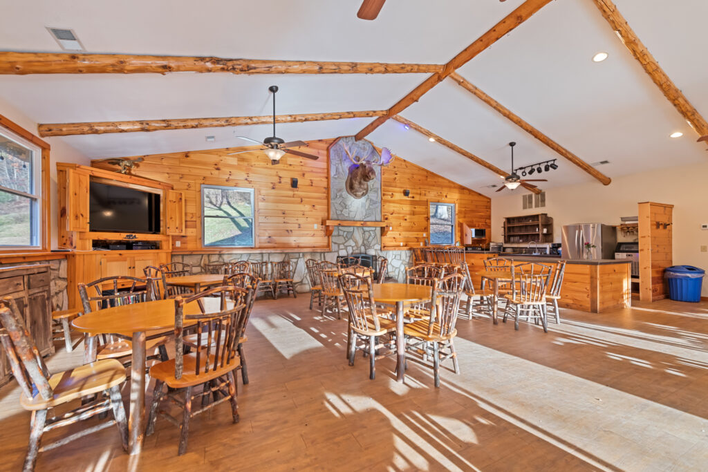 There’s a lot of options with tabletop seating for 40-50 indoors and room for many more outdoors on the covered pavilion porch. The large open kitchen has plenty of room for preparing and serving. The wide serving counters work well for catering in, preparing it yourself, or maybe a little of both. Restrooms, a fire pit, small playground, and outdoor grill complete the facility.